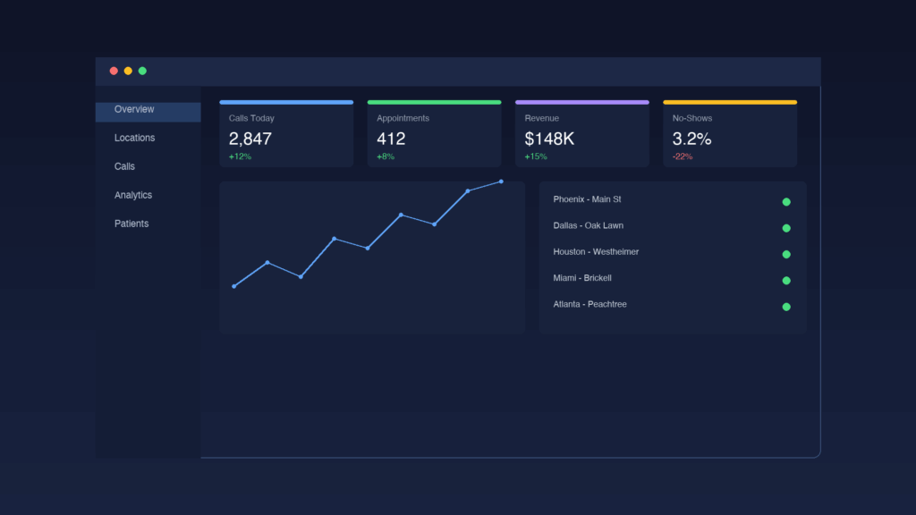 Manage AI performance, patient satisfaction, and booking rates across every DSO location from a single dashboard. No more location-by-location logins.
