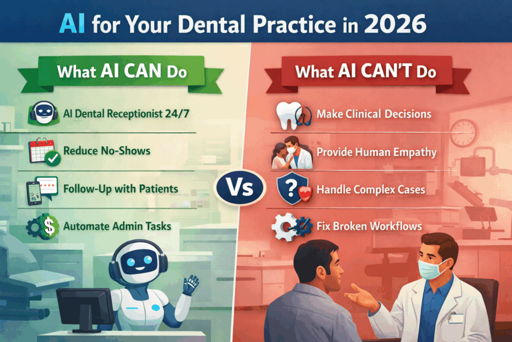 This article breaks down what AI can and can’t do for your dental practice in 2026, with a specific focus on the AI dental receptionist — one of the fastest-growing and highest-impact uses of AI in dentistry.